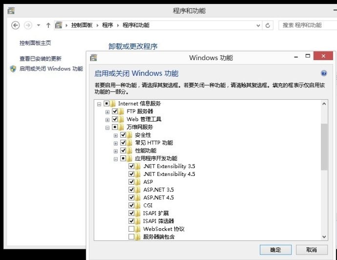 1、开启、设置win 10自带的IIS 8.5组件服务器、进入控制面板、选择程序和功能打开或关闭Windows 功能 找到Internet information services、分别开启 Web管理工具和万维网服务组件、其中万维网服务的子组件也依次开启、”其中最重要的开启应用程序开发功能” 记得选中CGI这一项 。